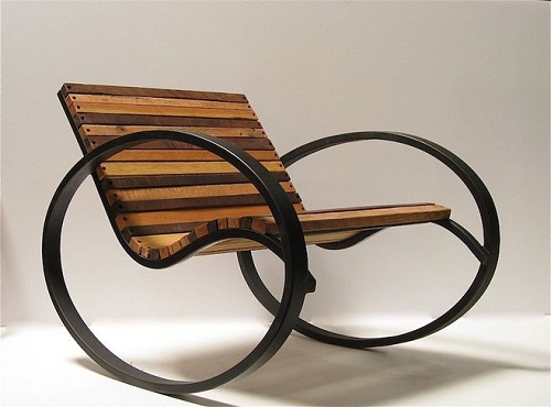 采用碳钢框架的摇椅,两个大大的椭圆钢圈既是扶手,又是摇椅的脚,座位和靠背采用木头做成。简洁、结实、大方,又不乏乐趣