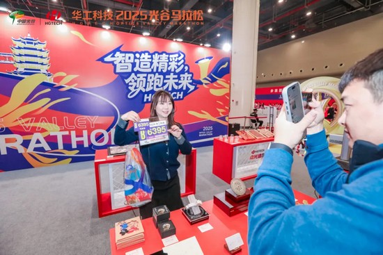 在半马、全马终点的华工科技展台,吸引了众多选手驻足参与,现场氛围热闹非凡。跑友们可参与趣味互动打卡,还能定制个人专属奖牌。看激光在金属上“画画”,为你镌刻独一无二的马拉松记忆,让科技传递光的温暖祝福。